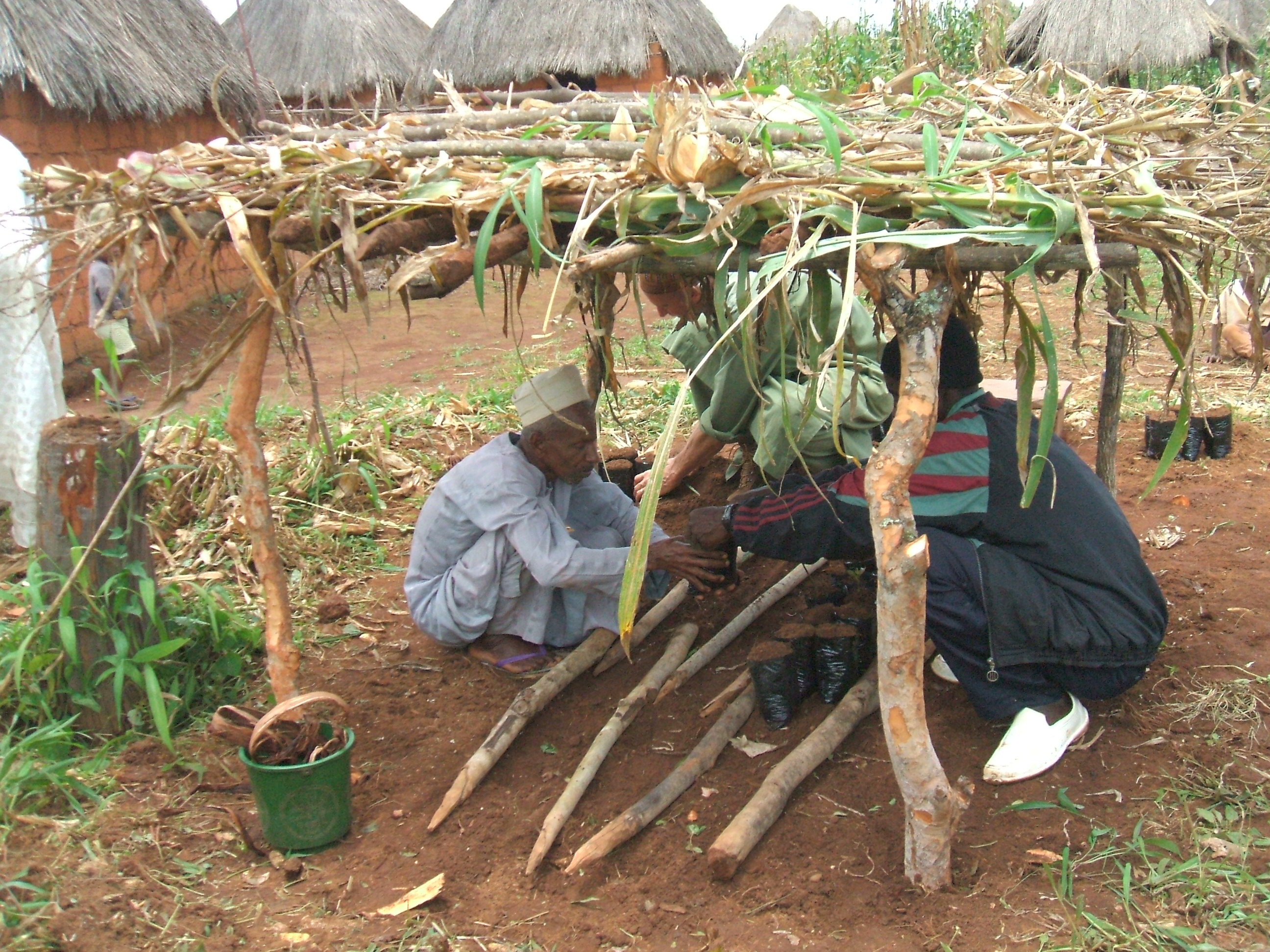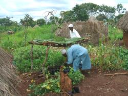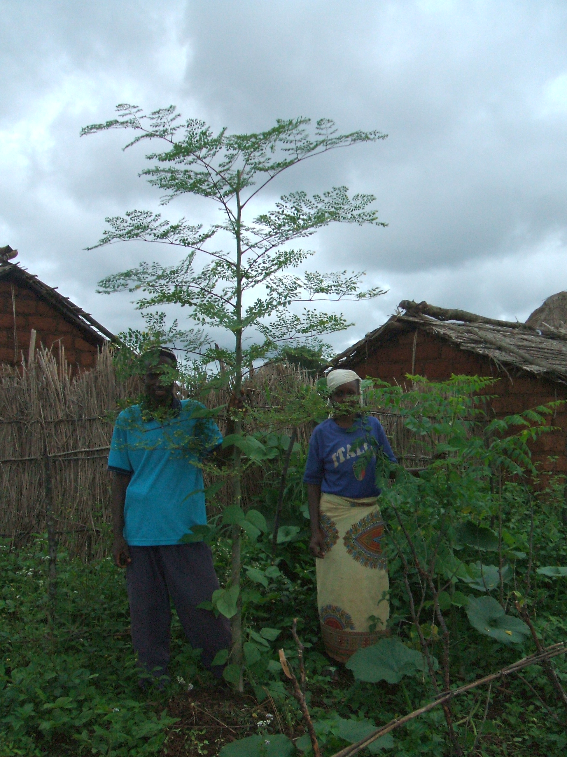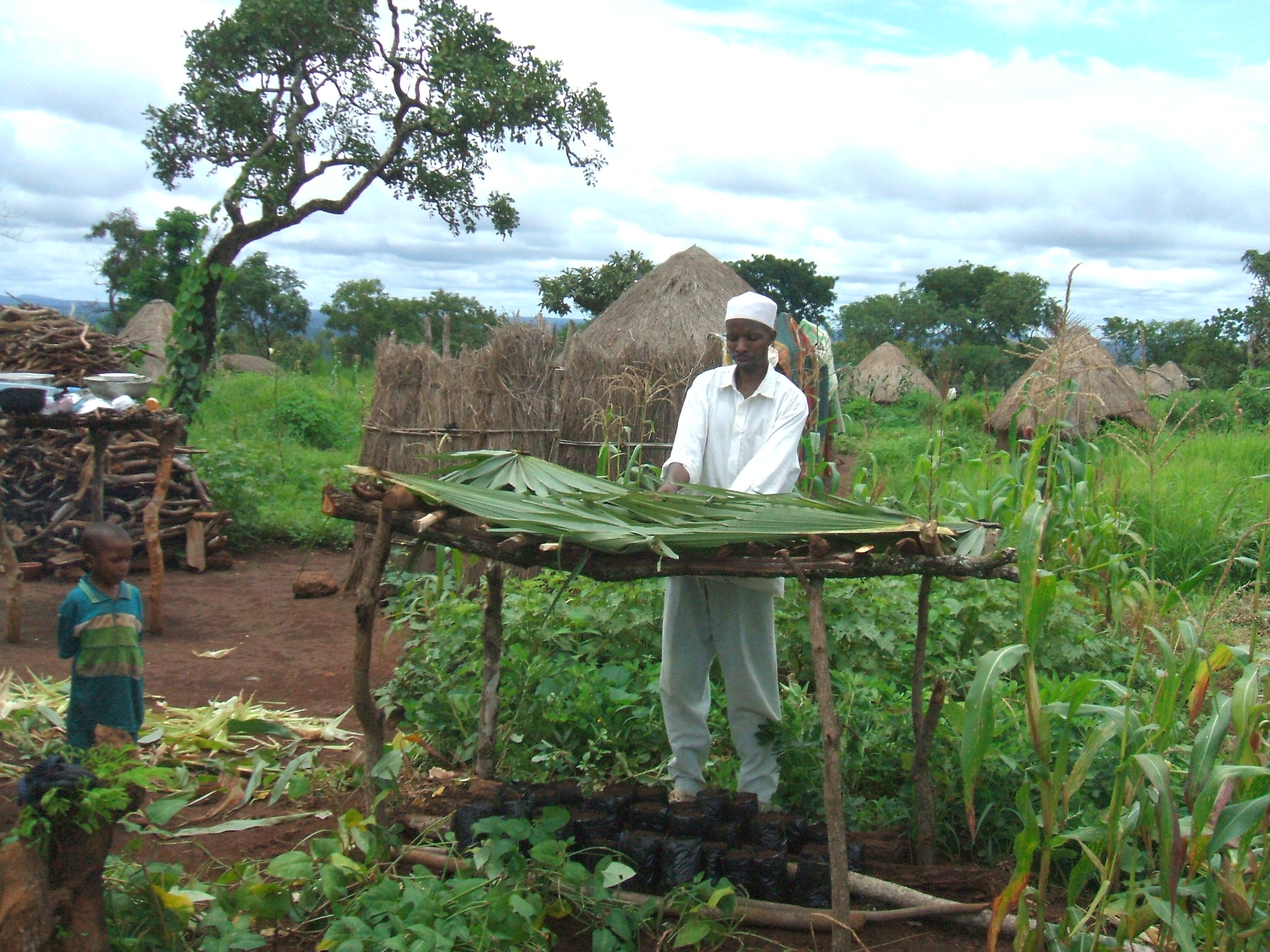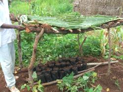 This Moringa tree was Locally-available materials are used to construct Palm fronds are used for the roof to allow The nursery is constructed close to the planted 5 months ago Moringa tree nurseries in the village limited water and sun to reach the poly bags compound for protection |