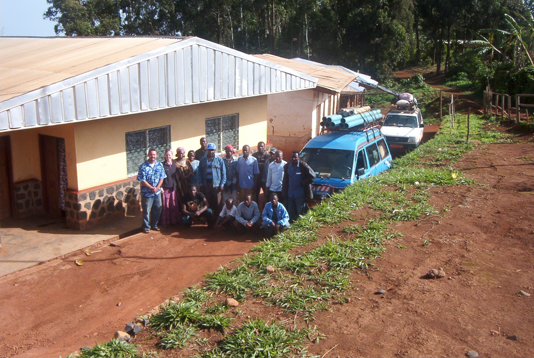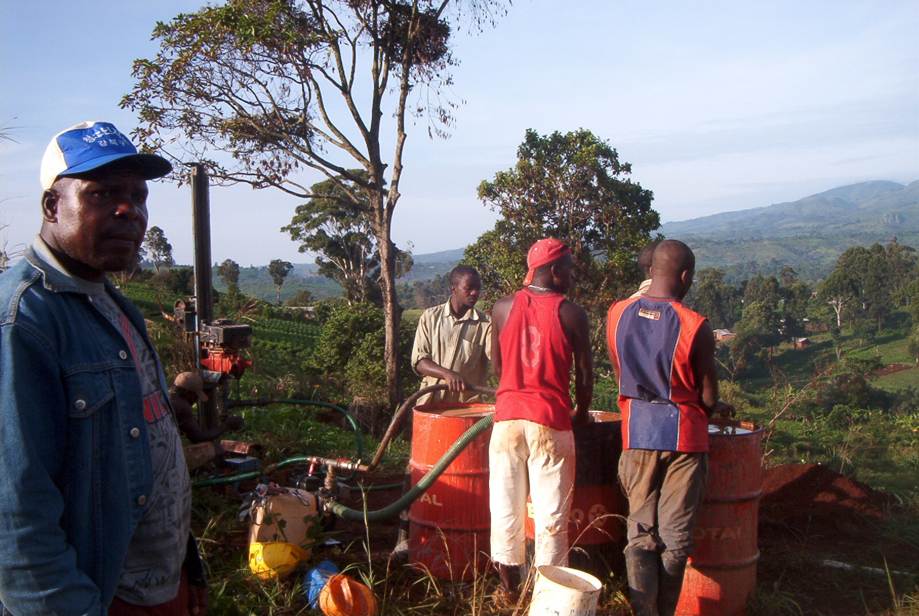 The crew prepares to leave for Bamenda Unloading the equipment at the farm The site is prepared to begin drilling And the work begins with prayer |