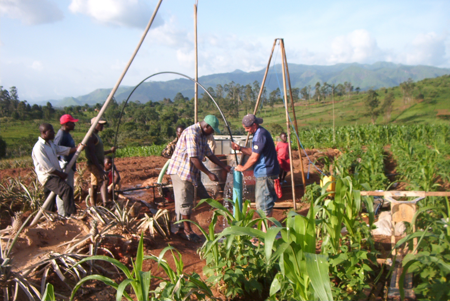 Let the drilling begin! Carrying water from a local stream for the work Changing drilling rods as we go to about 90' Developing the well to improve the quality |